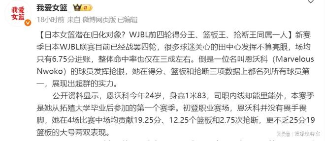 而日本队方面,他们内线已经人才凋零了。他们的顶尖内线渡嘉敷来梦已经34岁了,早已不复当年之勇了。短期内,未来保持竞争力,日本队归化一名强而有力的内线,似乎是非常要必要的。而根据知情人士透露,日本队方面已经有意归化恩沃科。数据显示,恩沃科今年只有24岁,身高1米83,属于内线球员,但却拥有外线球员的技术,能内能外,攻防一体,打法非常合适日本队。