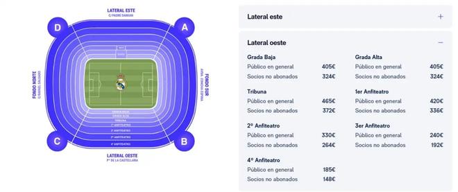 伯纳乌球场的8万张球票里,最便宜的价格,是135欧元(约合1120人民币),是第四层露天看台的位置,观赛效果不好。普通看台的最高票价则达到465欧元(近年来的最高记录)。两侧主看台的票价是405欧元,两端看台(球门区域)的票价是325欧元。VIP区的票价是990欧元起步。
