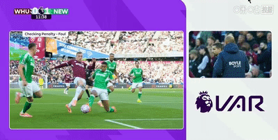 第10分钟,比分落后的西汉姆联继续加强攻势,又是鲍恩带球突入禁区被马利克-佳夫放倒,主裁判罗伯特-琼斯第一时间吹罚点球,不过随后VAR介入,琼斯亲自走到场边观看慢镜头回放,最终判罚佳夫先碰到球,点球取消。